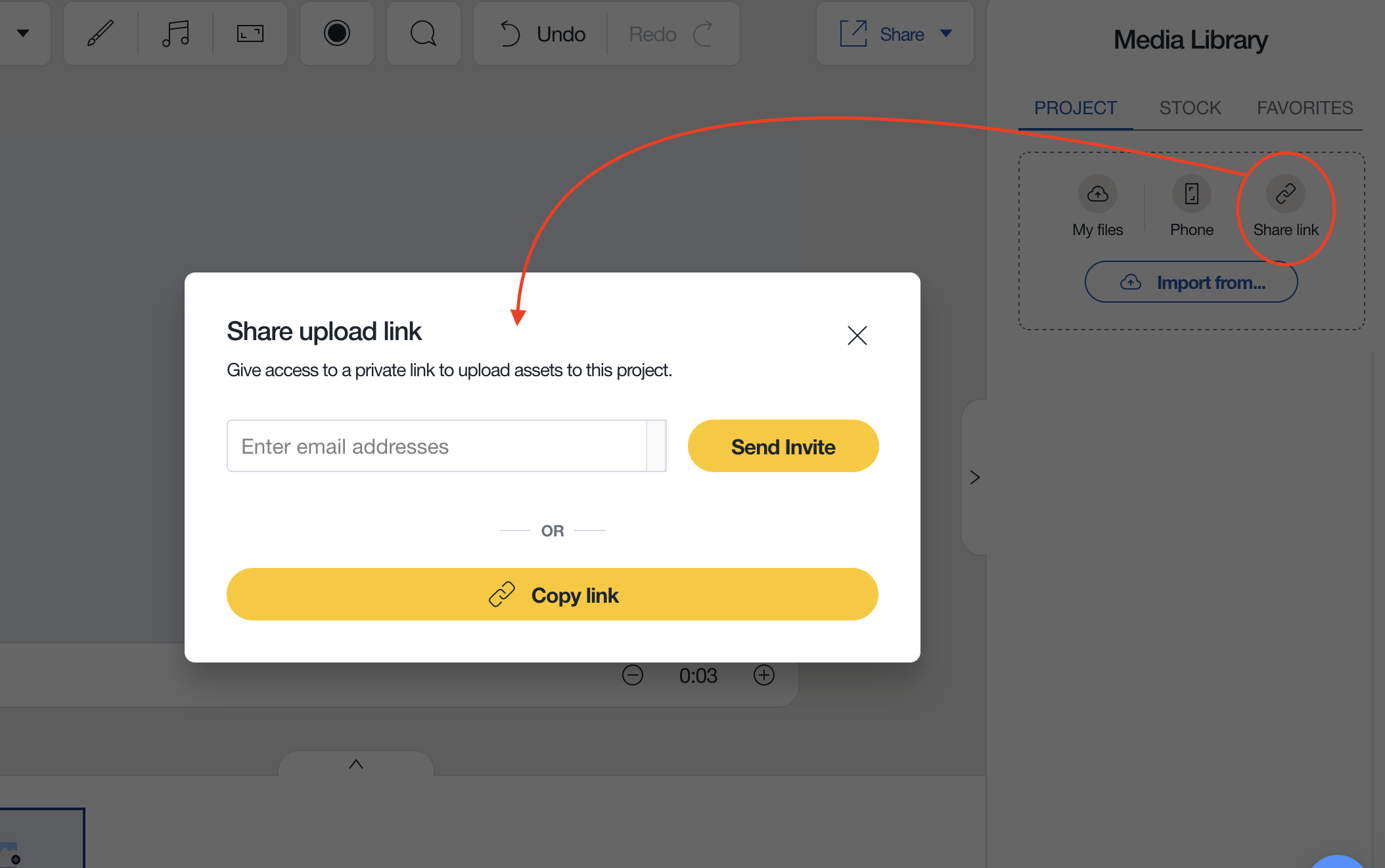 You now have the option to send out a link for others to drop their media directly into your project! From the Media Library, select Share Link. That will open a dialogue for you to either copy the import link, or email it directly. That will direct them to a link where they can select their media from their phone or device.