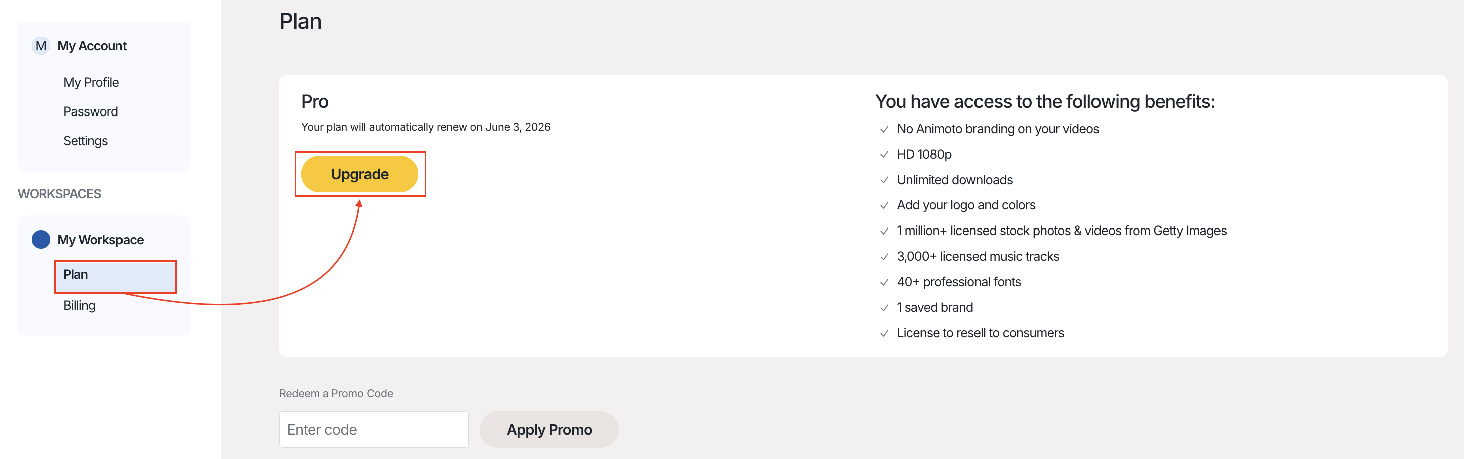 Navigate to the Plan tab on the Account page. Select Upgrade to be taken to the checkout page, and click Have a promo code? at the bottom of the screen to apply your promo code.